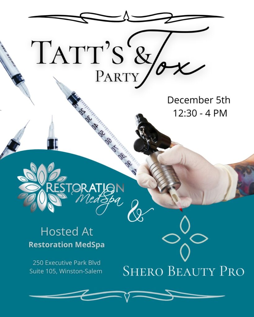 Join us January 10th from 11:00AM–3PM for our Tatts & Tox Party at our Winston-Salem office! No appointment needed — Botox + small tattoos by @sherobeautypro .